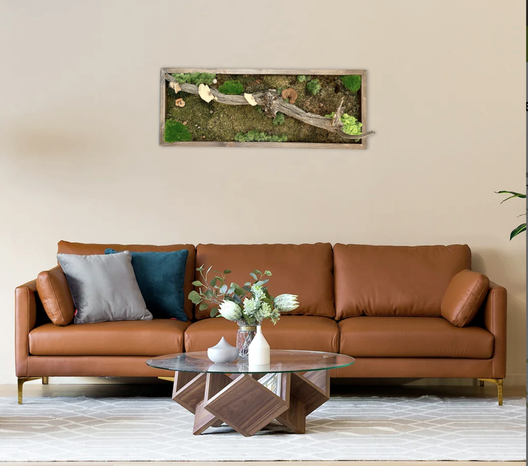 Why not add some design features to help incorporate the outside in, for example add a feature wall such as a living wall full of different plants a moss wall or wood cladding. These ideas can create a focal point. These plants don’t all have to be high maintenance some could be artificial plants, but real ones are better and have many health benefits. You could use a mixture of real and faux plants if you are not good at keeping them alive! You could also consider hanging plants from the ceiling or add a fun tree in spaces where you have high ceilings. Check out this fabulous wall art by local artist Ursula Csegoldi here.