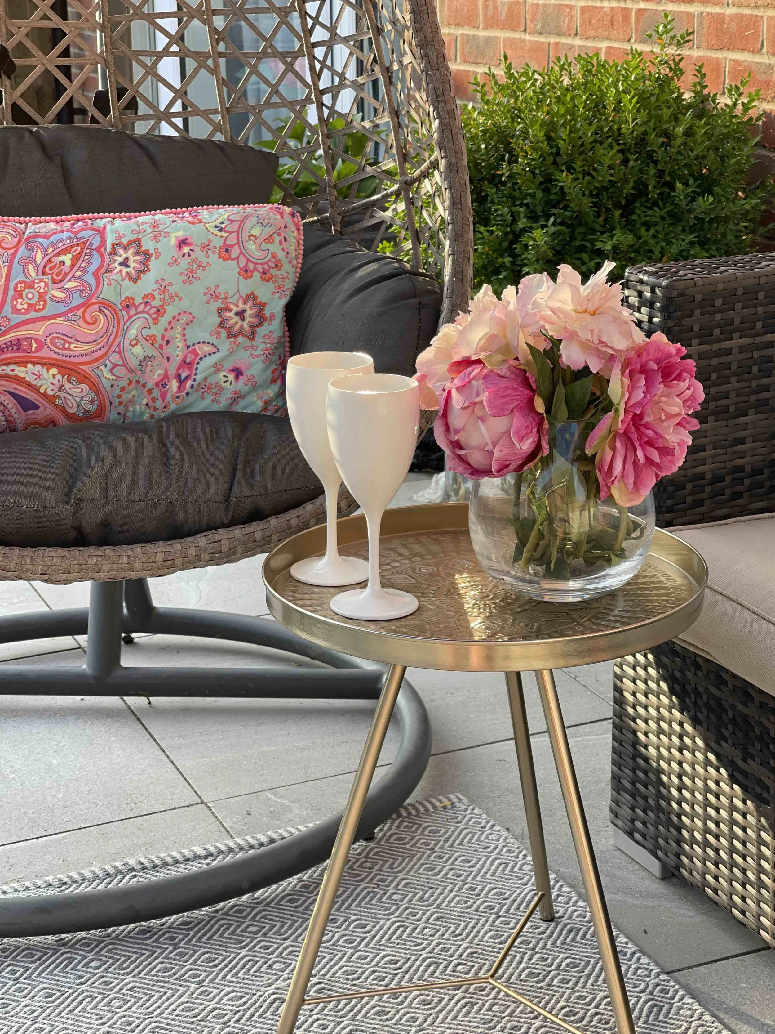 Bringing the inside out is another great way to make sure that your space flows from your home into your garden. You can create a cosy feeling on your patio by layering outside rugs, adding scatter cushions to your outside sofa and layering pots and outside lights. You could continue your colour scheme from inside through to your outside accessories.