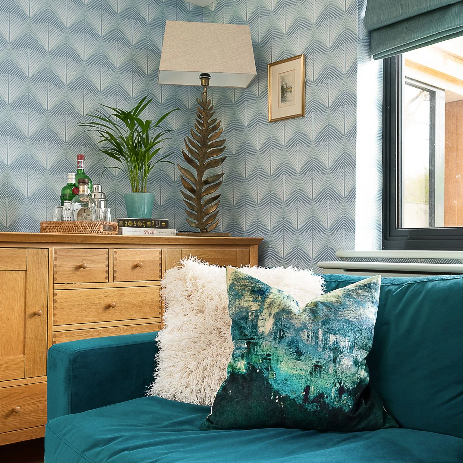 “Shades of blue and green were used to create a sense of calm and ‘bring the outside in.’ The colour palette to run through [the whole project] was the ocean, and this tied in with the botanical theme of the open plan space with the dark blue of the snug,” says Holly.