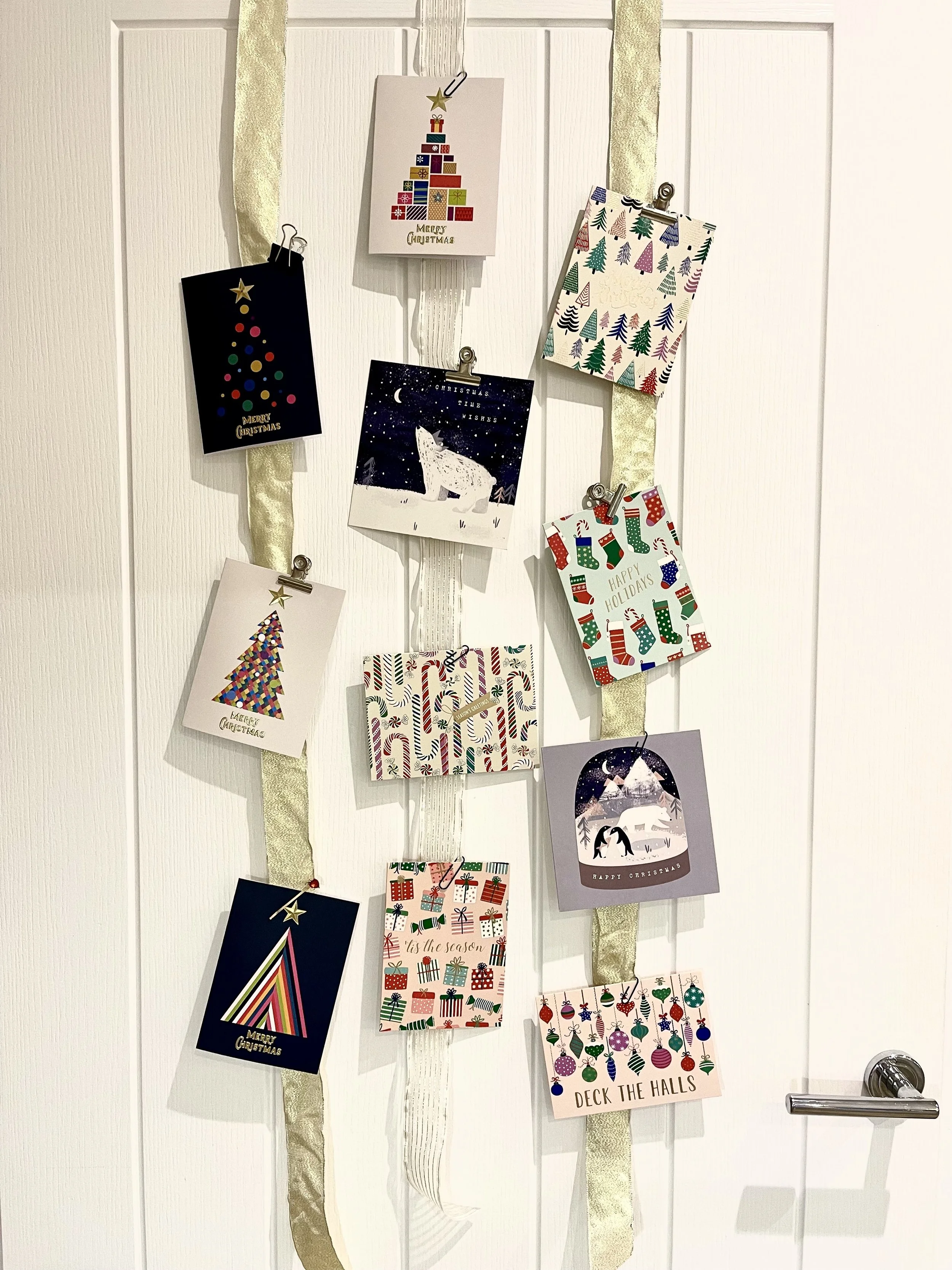 You can find some ribbon to fit in with your theme or colour scheme and you can attach your Christmas cards with paper clips or little bulldog clips in silver or black, like these ones I found here. You could hang your ribbon lengths on your walls, doors, or down the banisters on your stairs. Floristry Warehouse have a great selection of gorgeous ribbons to choose from.
