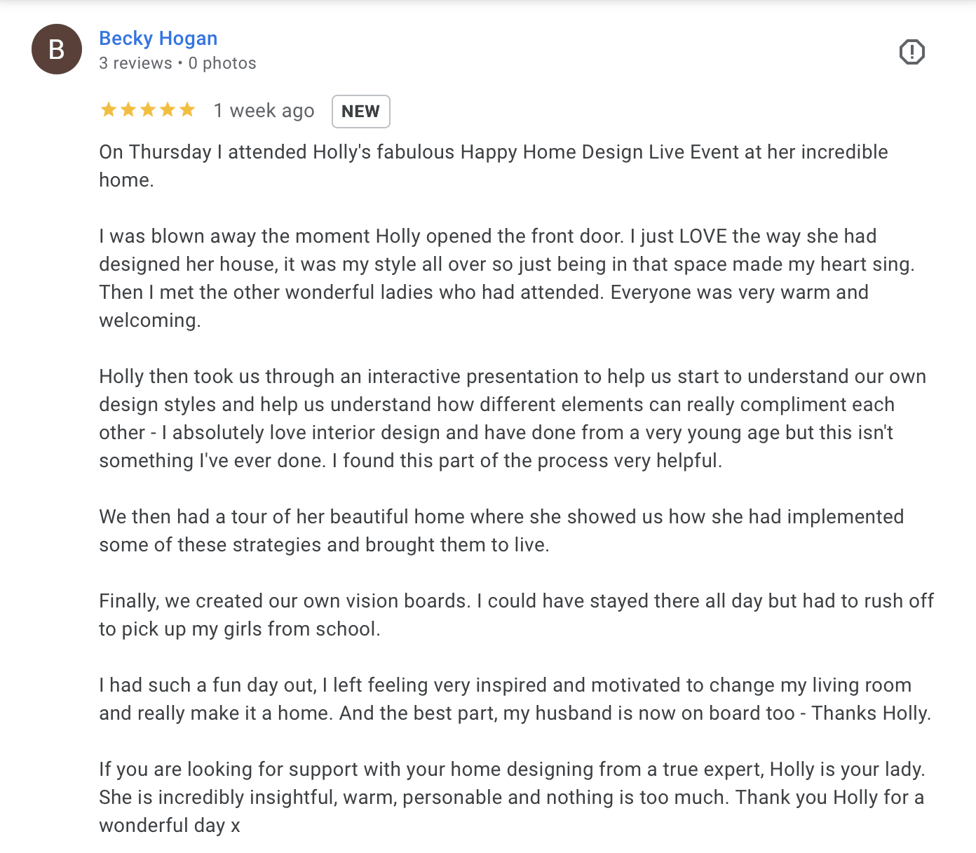 “I wasn’t really sure what to expect when I joined Holly’s interior design day. But with a whole house to renovate, I thought it would be a great place to start — to understand what I liked (and why) and to get plenty of inspiration.